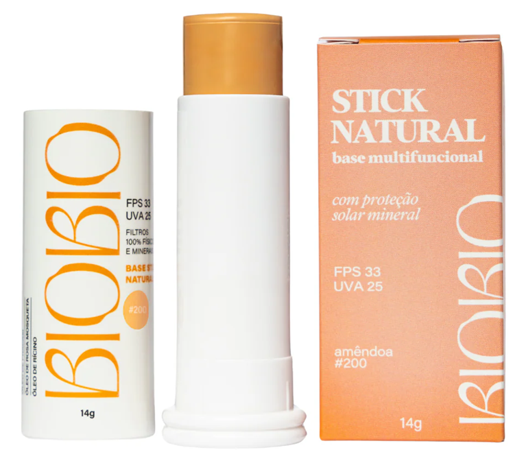 O Stick Natural, da BioBio, é vegano e hipoalergênico, rico em ativos vegetais, sendo livre de petrolatos, silicones e oxibenzona. Trata-se de um bastão multifuncional que funciona como base facial e protetor solar com cor. Contém FPS 33 e UVA 25 (fatores dermatologicamente testados). Ele combina ativos naturais que atuam contra os raios solares e também disfarçam as imperfeições da pele por meio de uma cobertura intensa.