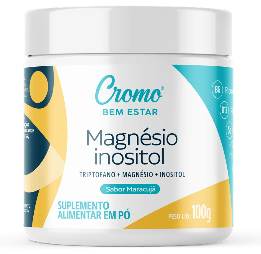 O Magnésio + Inositol, da Cromo Bem Estar, é um suplemento em pó zero açúcar, sem glúten, sem lactose e livre de corantes e conservantes sintéticos. Cerca de 3,3g (1 dosador) fornece 150mg de Magnésio (36% da recomendação diária padrão), 50mg de Triptofano, 2g de Inositol, 9µg de Vitamina B12 (375% da recomendação diária padrão) e 10mg de Vitamina B6 (769% da recomendação diária padrão). O sabor é de maracujá e já vem adoçado com Stevia.