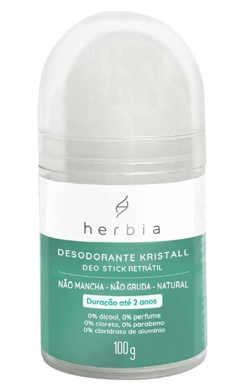 O Desodorante Natural Kristall Deo Stick, da Herbia, é natural, vegano, cruelty-free, hipoalergênico e sem perfume, livre de cloridrato de alumínio, álcool, parabenos e triclosan. Ele é produzido com alúmen de potássio, também chamado de cristal de alúmen, formado por sais minerais que eliminam as bactérias causadoras de odor corporal e mantém sua proteção desodorante por até 24 horas. Ele não mancha roupas e não deixa resíduos.