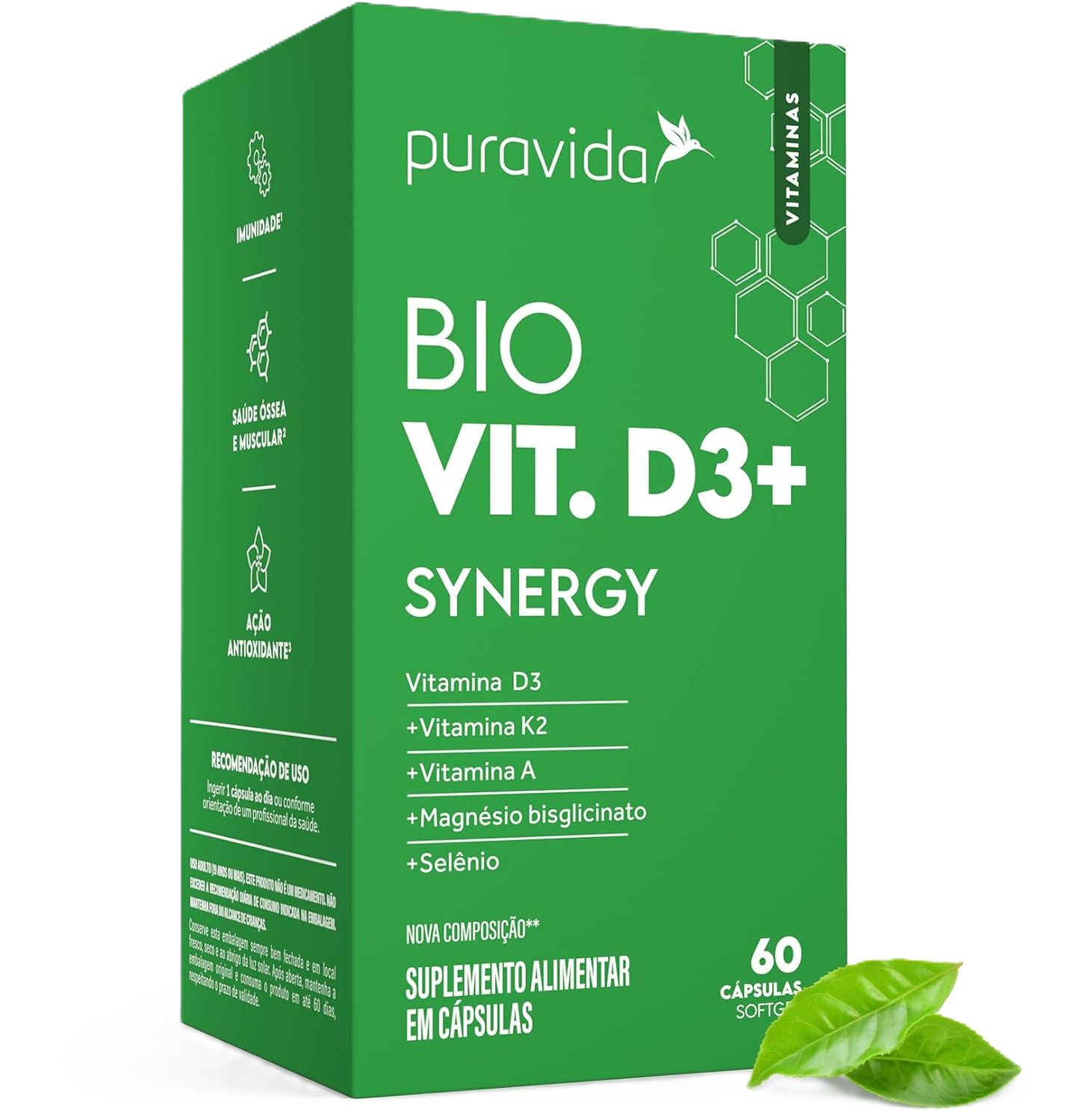 A deficiência de Vitamina D atinge grande parte da população e compromete ossos, músculos e imunidade. O Bio Vit. D3 + Synergy, da Puravida, fornece em cada cápsula 50 μg de Vitamina D3 (2.000 UI ou 333% da recomendação diária padrão), 100 μg de Vitamina K2 (83%), 900 μg de Vitamina A (113%), 63 mg de Magnésio (15%) e 167 μg de Selênio (278%). Esses nutrientes atuam em perfeita sinergia para equilibrar os níveis de cálcio e fósforo no sangue, promovendo a fixação dos minerais nos ossos e fortalecendo sua densidade óssea. Além disso, contribuem para o processo de divisão celular, o bom desempenho muscular e o fortalecimento do sistema imunológico.