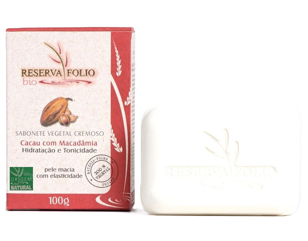 O Sabonete de Cacau e Macadâmia, da Reserva Folio, é 100% natural, orgânico e vegano, livre de sulfatos, parabenos e petrolatos. É feito com a combinação da manteiga de cacau, rico emoliente natural, e do valioso óleo de macadâmia, rico em antioxidantes. Juntos, auxiliam a hidratar e nutrir, melhorando a tonicidade e elasticidade da pele. Seu uso diário ajuda a manter a pele com tônus suave e macio e com uma luminosidade característica da pele saudável.