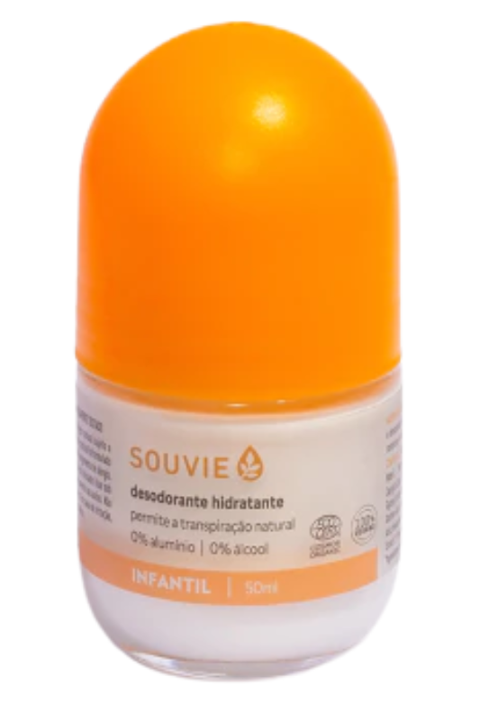 O Desodorante Natural Hidratante Roll-on, da linha Souvie Infantil, é 100% natural, vegano e orgânico, livre de cloridrato de alumínio, parabenos e triclosan. É indicado para as crianças a partir dos 8 anos de idade, com intuito de prevenir os maus odores causados durante a transpiração. Para tanto, ele faz o uso do Citrato de Trietil, produzido por fermentação do álcool da cana-de-açúcar, um neutralizador da ação de enzimas responsáveis pela decomposição do suor.