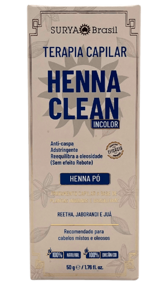 A Henna Clean em Pó Incolor, da linha Terapia Capilar by Surya, é 100% natural, vegana, hipoalergênica e dermatologicamente testada, sendo livre de PPD, parabenos, água oxigenada, amônia, metais pesados e resorcinol. Ela deve ser aplicada tal qual uma tintura henna, porém, seu intuito é deixar os cabelos mistos e oleosos mais limpos e radiantes, sem colori-los. Para isso, esta henna incolor atua removendo o excesso de oleosidade (sem causar efeito rebote) e proporciona alívio da irritação, descamação e coceira. O resultado são cabelos mais saudáveis, vigorosos e sem caspa.