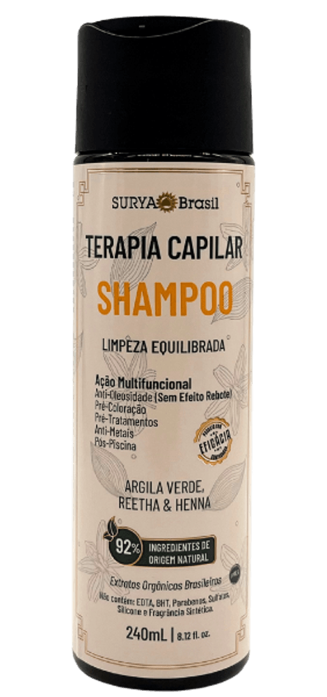 O Shampoo Limpeza Equilibrada, da linha Terapia Capilar by Surya, é 92% natural, vegano, hipoalergênico e dermatologicamente testado, sendo livre de sulfatos, petrolatos e parabenos. Ele está liberado para low-poo e é indicado para todos os tipos de cabelos, sobretudo para a retirada de metais pesados, silicones e cloro pós piscina e na preparação de processos de coloração ou outros tratamentos químicos. Ele promove a limpeza gentil dos fios por meio de agentes derivados do Óleo de Coco, que reduzem a carga estática e melhoram a penteabilidade.