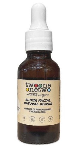 O Elixir Facial Diurno, da Twoone Onetwo, é 100% natural e vegano, livre de parabenos, petrolatos e silicones. Ele funciona como um óleo facial de sensorial leve não-oleoso para revitalização da pele. Seu destaque é o Óleo de Buriti, rico em vitamina A e tocoferóis, componentes responsáveis pelo aumento da elasticidade na pele e pela diminuição do ressecamento causado por fatores externos, como radiação solar e mudanças bruscas de temperatura. Outro carro-chefe é o Óleo de Café Verde, um ativo ideal para o rejuvenescimento, composto por antioxidantes combatentes dos radicais livres. Ele ainda é enriquecido com óleos vegetais de Girassol, Gergelim, Macadâmia, Milho e Oliva, potencializadores da hidratação e da nutrição cutânea. Por fim, a presença do Óleo Essencial de Palmarosa ajuda a regenerar as áreas danificadas e empresta seu aroma floral ao produto.