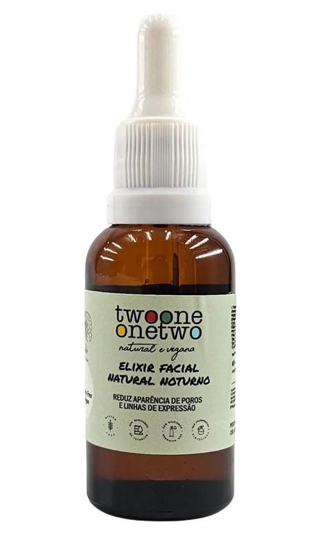 O Elixir Facial Noturno, da Twoone Onetwo, é 100% natural e vegano, livre de parabenos, petrolatos e silicones. Ele funciona como um óleo facial redutor de linhas de expressão e uniformizador do tom de pele. Para isso, faz uso do Extrato de Picão Preto, ativo vegetal que estimula a produção de fibroblastos, as células que trabalham inibindo os principais indutores do processo microinflamatório relacionados ao envelhecimento precoce da pele. Ele faz parceria com o Óleo de Algodão, rico em vitamina E (α-tocoferol), um antioxidante natural que combate os efeitos cumulativos dos raios UV, e com o Óleo de Abacate, fonte de nutrientes e aminoácidos capazes de acalmar irritações e "fechar" lesões superficiais. Este elixir noturno contém ainda óleos vegetais de Girassol, Gergelim, Macadâmia, Milho e Oliva, potencializadores da hidratação e da nutrição cutânea. Por fim, a presença do Óleo Essencial de Palmarosa ajuda a regenerar as áreas danificadas e empresta seu aroma floral ao produto.