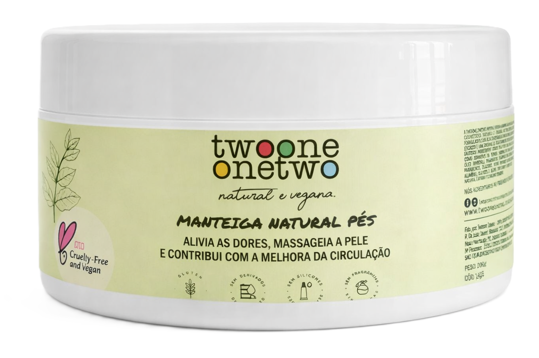 A Manteiga Natural para os Pés, da Twoone Onetwo, é 100% natural e vegano, livre de parabenos, petrolatos e silicones. Seu ingrediente-chave é Manteiga de Karité, que hidrata profundamente áreas secas e ressecadas, promove maciez e efeito aveludado, além de fortalecer a barreira cutânea de proteção natural. É enriquecido com Cera de Candelila, Glicerina e um blend óleos vegetais de Macadâmia, Gergelim, Girassol e Oliva, ricos em componentes umectantes e ultra hidratantes. Contém ainda óleos essenciais de Alecrim e Hortelã que possuem ação antisséptica, bactericida e promovem alívio nas dores, cansaço e inchaço dos pés.