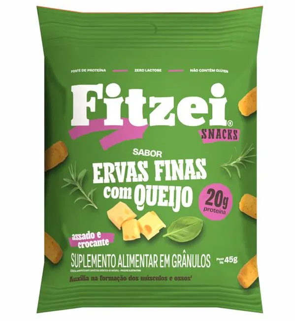 A composição do snack Fitzei Sabor Ervas Finas com Queijo é composta por Proteína de Ervilha, uma fonte vegetal reconhecida pela boa digestão e associada à preservação da estrutura muscular e óssea, além de Farinha de Milho, Óleo de Girassol, Queijo em Pó, Extrato de Leveduras (substituto natural para o glutamato monossódico), e corante natural de Curcumina, uma combinação pensada para garantir a ingestão regular de proteínas sem complicações.